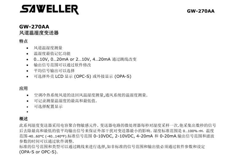 • 風管溫濕度傳感器GW-270AA