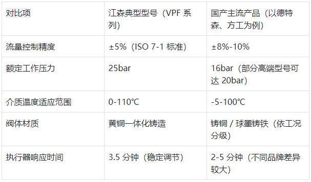 江森二通閥的核心優(yōu)勢在于動態(tài)平衡與電動控制一體化。以VPF系列為例,其內(nèi)置獨立平衡閥結(jié)構(gòu),能在20-200kPa壓差波動范圍內(nèi)維持流量恒定,從根源解決暖通系統(tǒng)水力失調(diào)問題,尤其適配大型中央空調(diào)的變流量系統(tǒng)。這種 “抗干擾能力” 是國產(chǎn)多數(shù)基礎(chǔ)型號不具備的——國產(chǎn)閥更側(cè)重基礎(chǔ)通斷/調(diào)節(jié)功能,僅少數(shù)高端型號(如上品森超級雙相鋼系列)通過外置平衡組件實現(xiàn)類似效果,但系統(tǒng)集成度較低。​